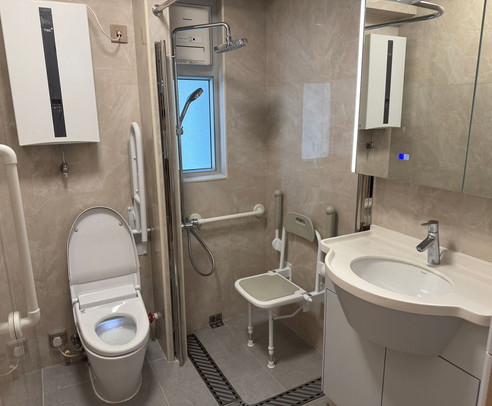 浴室與廚房 安裝防滑地板、隱藏式扶手及安全收納設計;